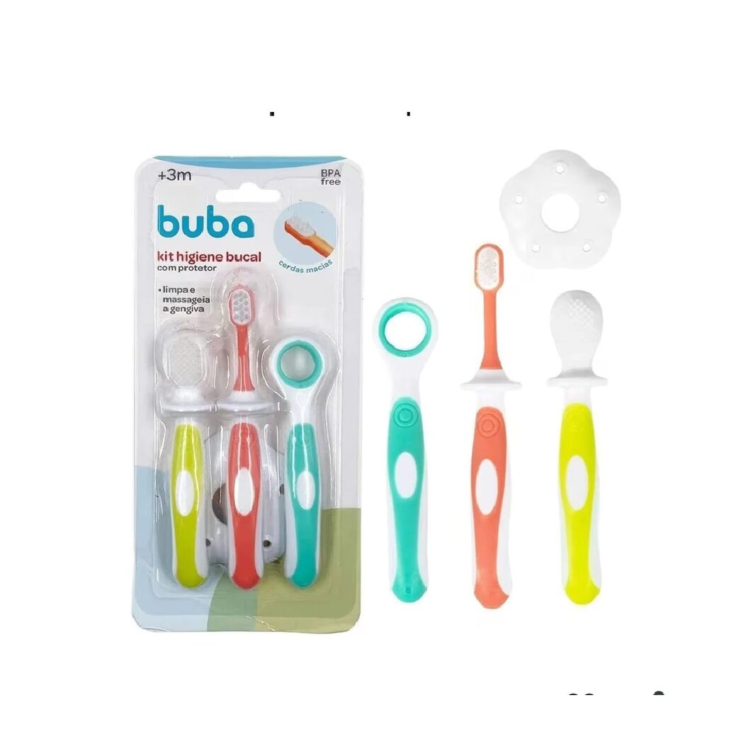 Kit Higiene Bucal da Buba é um conjunto para bebês a partir de 3 meses, focado na limpeza da gengiva, língua e primeiros dentinhos, que inclui massageadores de silicone e escova com cerdas macias, além de um protetor para evitar que a criança introduza os itens muito fundo na boca, garantindo segurança e conforto, sendo feito de materiais livres de BPA, e podendo ser esterilizados em água fervida.