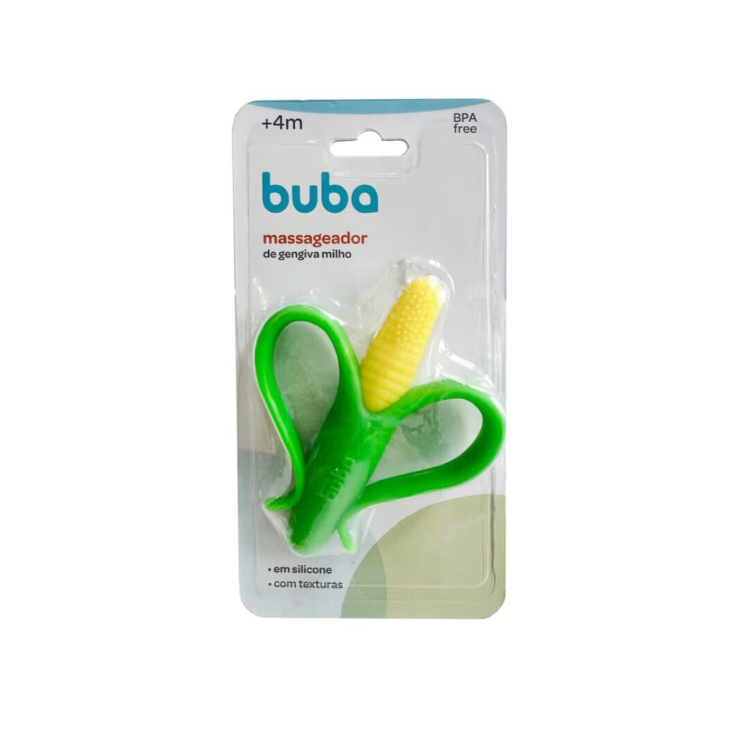 O Massageador de Gengiva Milho da Buba é um mordedor de silicone macio, com formato dirvertido de milho, prohetado para aliviar o desconforto da dentição em bebês a partir de 4 meses, apresentando cerdas texturizadas para massagear as gengivas sensíveis e estimular a região, sendo seguro (livre de BPA) e fácil de segurar.