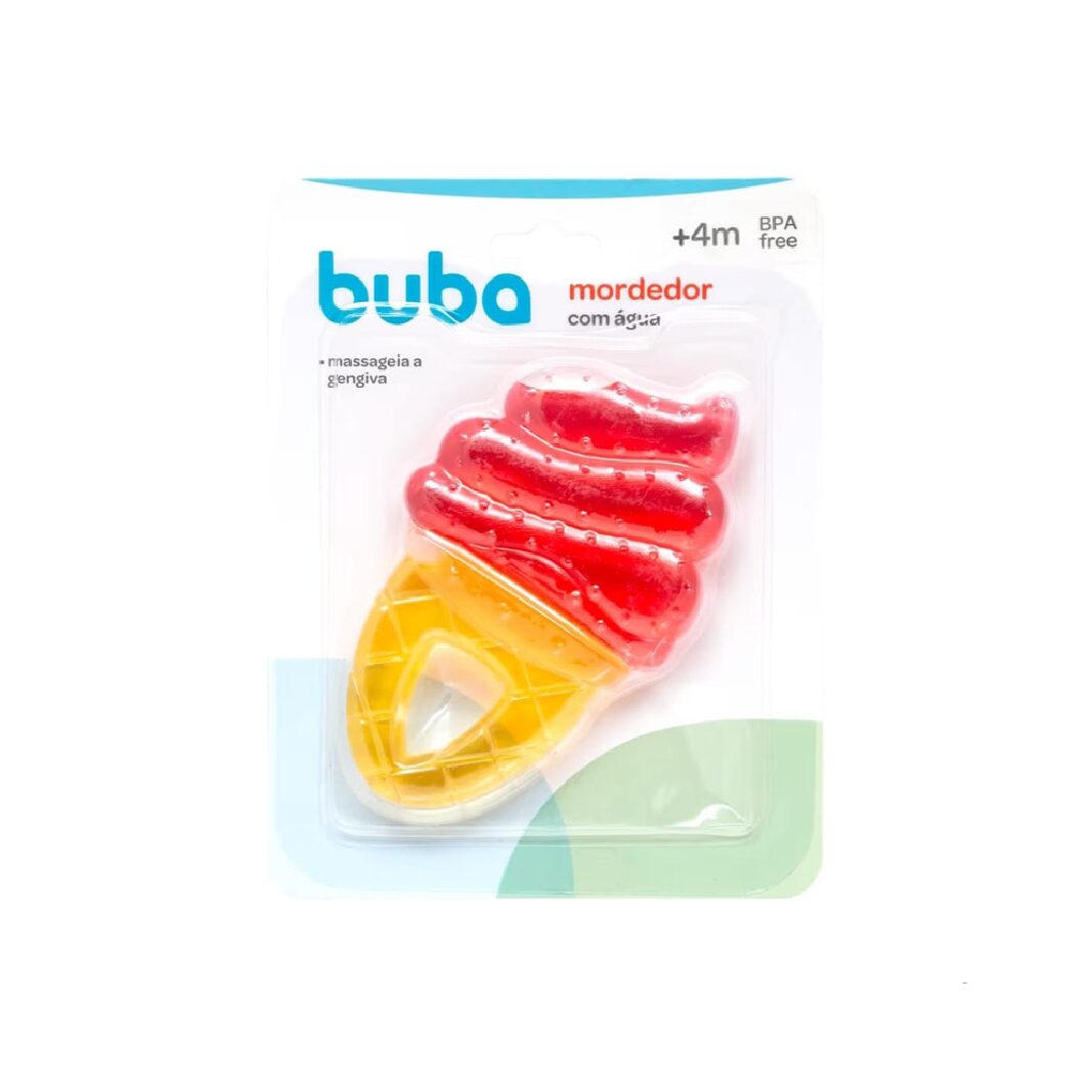O mordedor de água Buba formato sorvete é um brinquedo macio, leve e suguro (livre de BPA) com água purificada dentro, ideal para aliviar o desconforto da dentição a partir dos 4 meses, pois pode ser resfriado na geladeira para um efeito calmante, possui um formato divertido de sorvete, cores vibrantes e texturas que erstimulam o bebê e facilitam o agarre, mas não deve ser fervido, levado ao micro-ondas ou freezer, sendo essencial o uso sob supervição adulta.